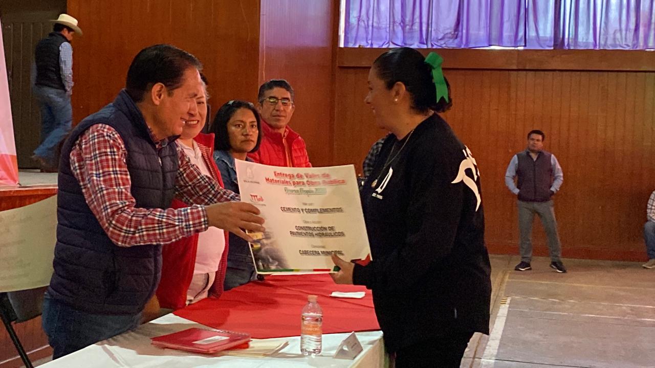 *.- Entrega vales de material a autoridades auxiliares correspondiente a 800 toneladas de cemento y agregados para que inicien con infraestructura en sus localidades.