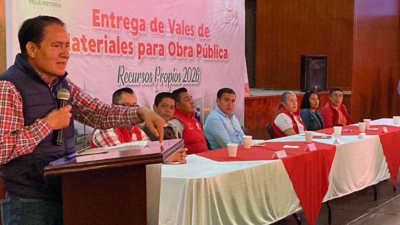 Villa Victoria, Estado de México; 11 de abril de 2026.- “Con el trabajo coordinado de cada uno de ustedes estaremos construyendo condiciones para un desarrollo urbano digno en beneficio de sus localidades, mejorando la calidad de vida de sus habitantes y consolidando la infraestructura de Villa Victoria”, dijo el presidente municipal Mario Santana Carbajal durante la entrega de vales de materiales a delegados y Copacis de diferentes localidades, con ello marca el inicio de obra 2026 con recursos propios.